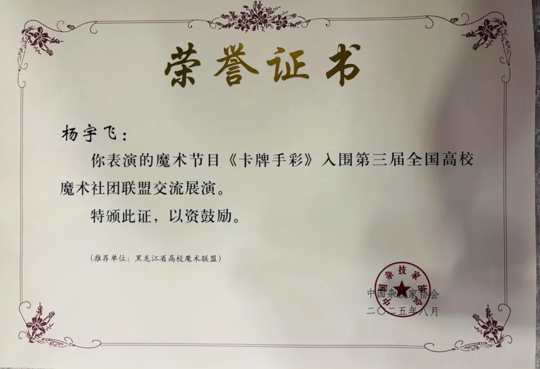 8月12日晚,第三届全国高校魔术社团联盟展演精彩上演。经过层层筛选,17个优秀节目集中亮相,涵盖近景、舞台、古彩戏法等多个类别。我省哈尔滨工业大学杨宇飞表演的魔术节目《卡牌手彩》入围第三届全国高校魔术社团联盟交流展演并获得现场专家和观众的一致好评。
