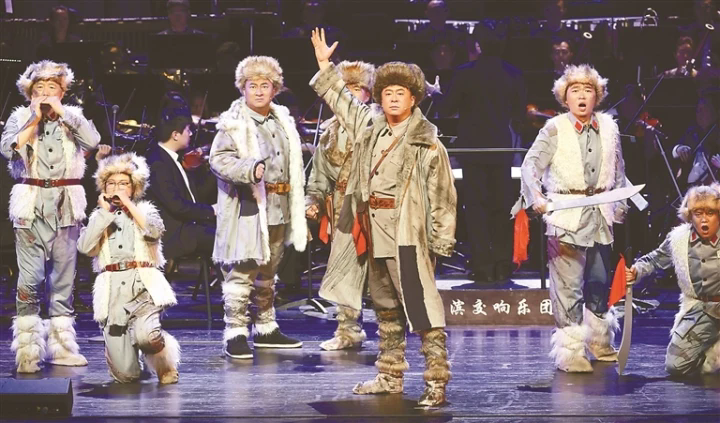 交响乐自19世纪以来便被视为承载宏大叙事、表达民族精神的重要艺术形式。黑龙江作为东北抗联的核心活动区域,拥有丰富的历史资源和厚重的精神遗产。在这场音乐会中,交响乐不仅作为背景音乐出现,更是结构性主导叙事的手段。序曲《信仰之光》大量融入《国际歌》《红旗颂》等音乐元素,以强烈的铜管与弦乐推进,凸显坚定信念,构建出崇高的听觉意象,奠定整个作品的史诗基调。《松花江上》以旋律唤起集体记忆,由《浪花里飞欢乐的歌》和《太阳岛上》为主导素材进行创作,《血战到底》通过节奏、和声与动态对比,模拟战争中的冲突、牺牲与胜利,实现历史情境的声音重构,艺术地再现英雄人物杨靖宇、赵尚志、赵一曼等和“八女投江”等真实历史事件,强化了黑土地与抗联精神之间的“地理—文化”关联,使地域文化成为国家叙事中不可或缺的组成部分。