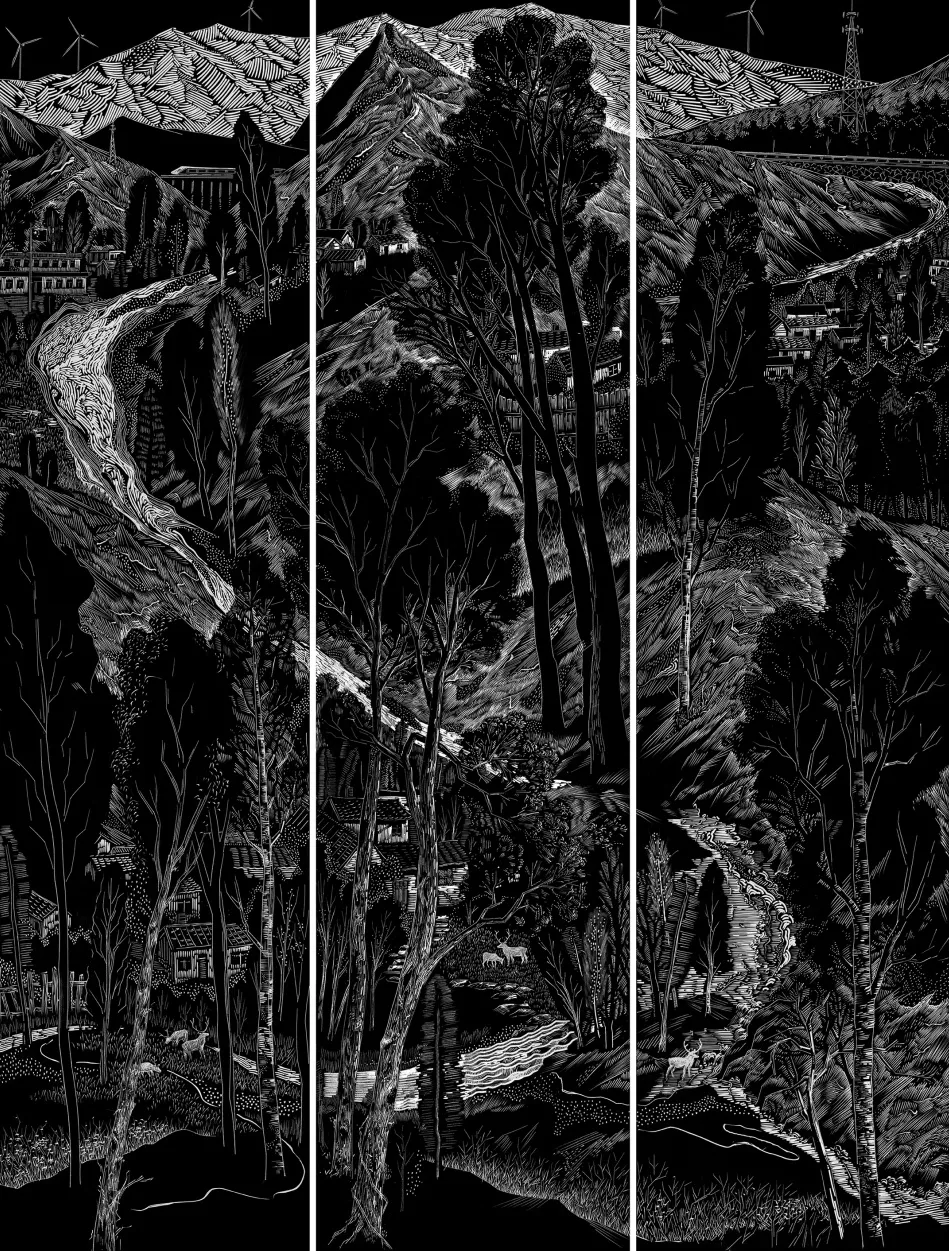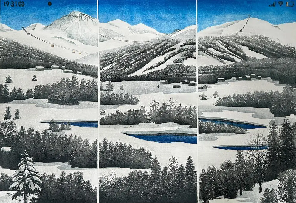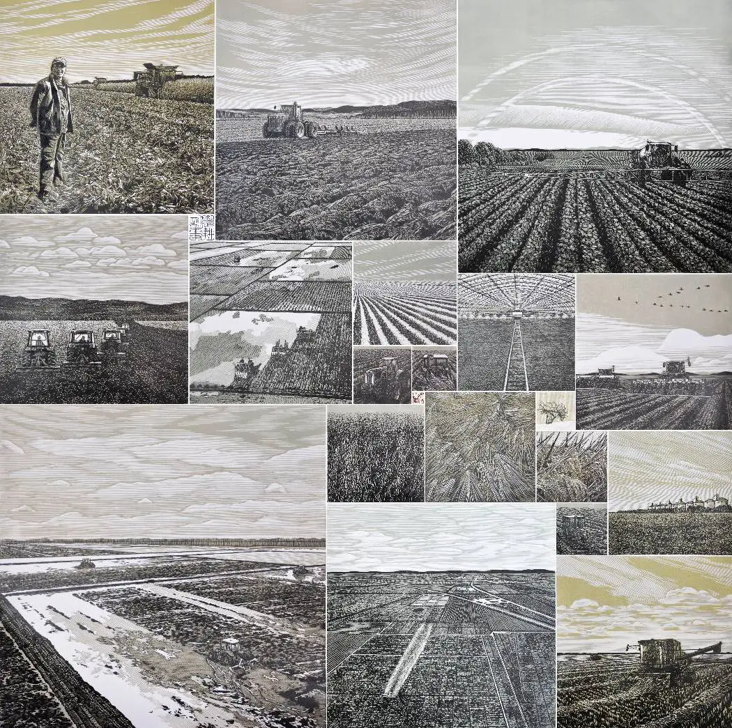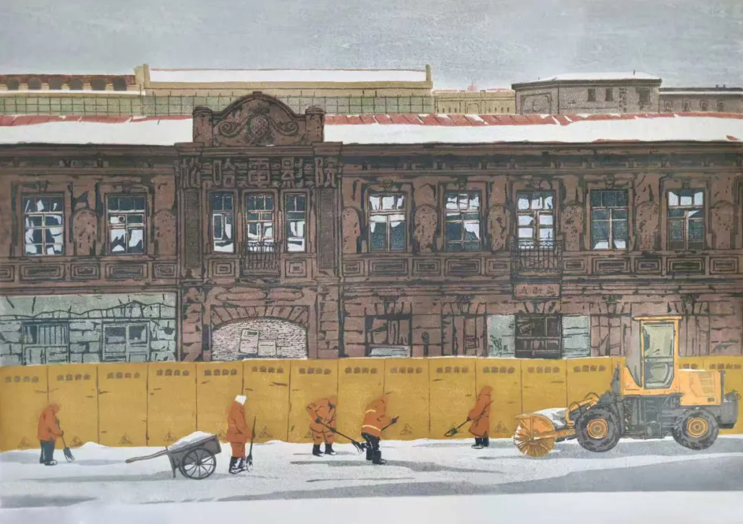 黑龙江省版画以其独特的油印套色技术和浓郁的黑土地域风情闻名,作品多展现北国壮丽的自然风光、厚重的农耕文明以及工业发展印记,风格浑厚大气、刀法刚健利落。此次入选的17件作品延续了传统的地域特色和时代气息,通过强烈的刀痕表现力和丰富的叙事性,展现了黑土地的生命力与艺术感染力。
