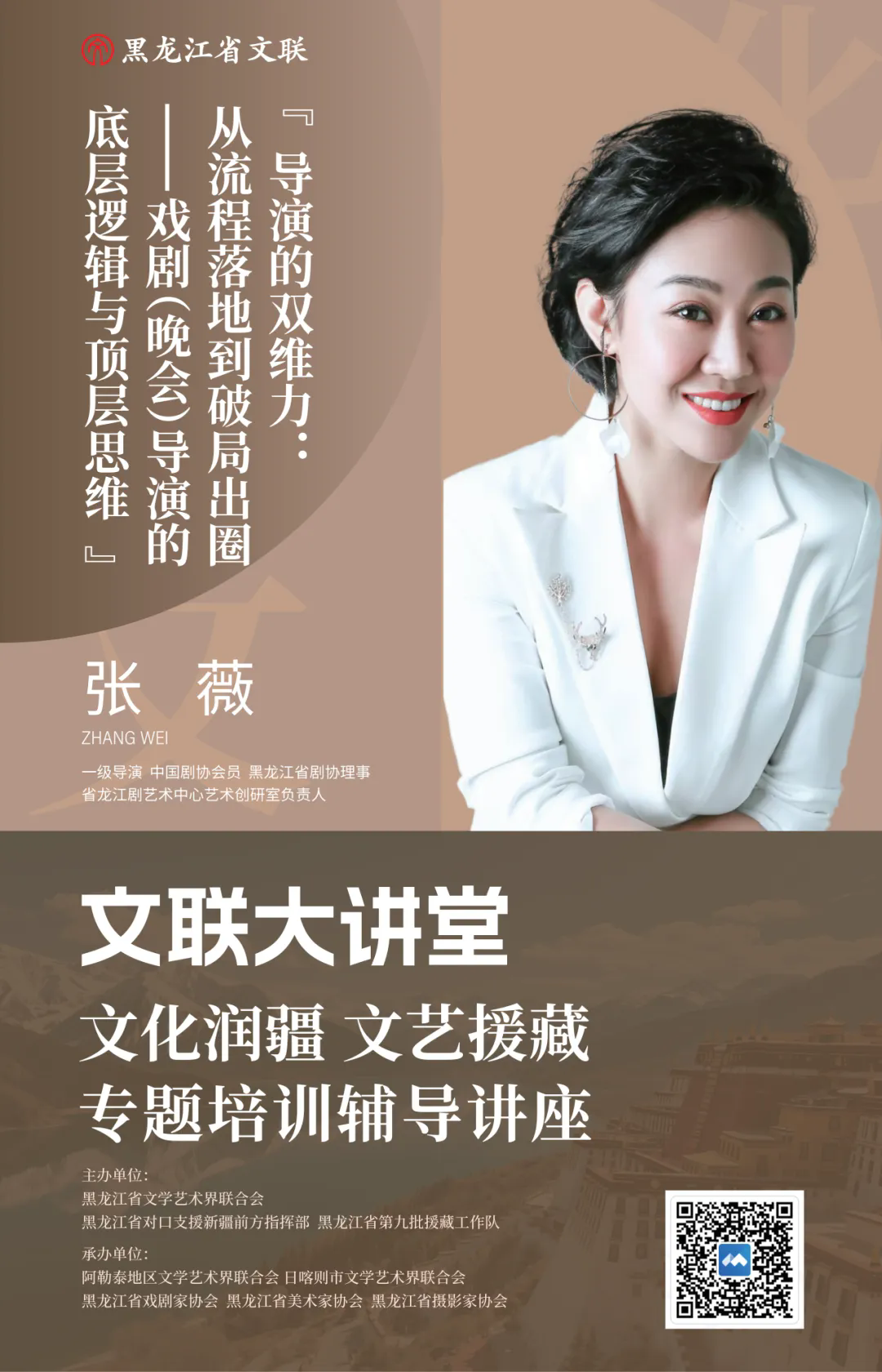 由黑龙江省文学艺术界联合会、黑龙江省对口支援新疆前方指挥部、黑龙江省第九批援藏工作队主办,阿勒泰地区文联、日喀则市文联、黑龙江省戏剧家协会、黑龙江省美术家协会、黑龙江省摄影家协会承办的黑龙江省文联“文化润疆 文艺援藏”专题培训辅导讲座第三期《导演的双维力:从流程落地到破局出圈——戏剧(晚会)导演的底层逻辑与顶层思维》将于9月30日14时在腾讯会议APP线上开讲。