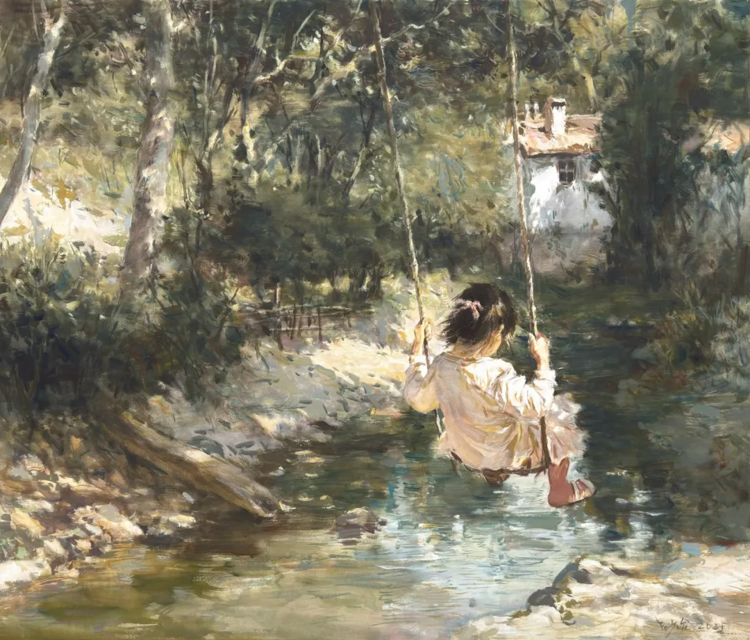 张钞治《林间溪语》水彩粉画