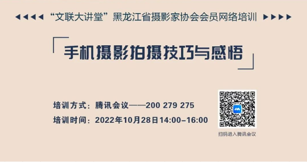 为加强我省摄影队伍建设,不断提高会员专业素质和创作能力,省摄协应会员需求将于10月28日下午14时举办省摄协网络会员培训,届时邀请摄影家吴树江作题为《手机摄影拍摄技巧与感悟》的讲座,请全省摄影爱好者及时关注。