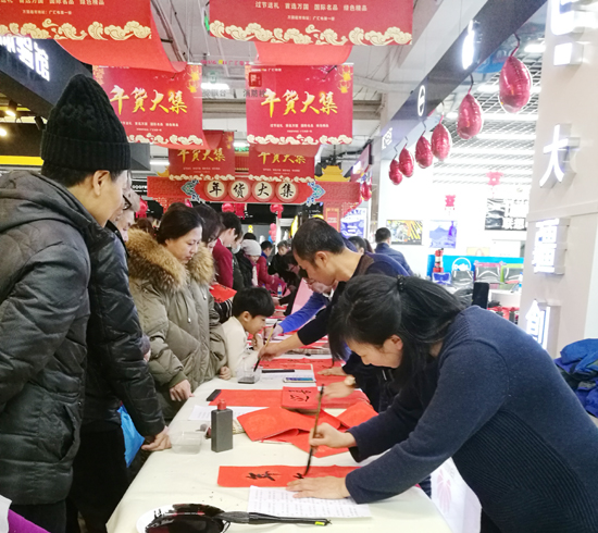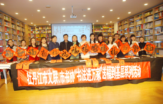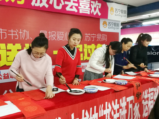 1月13日下午,牡丹江市文联组织市书协妇女书协到苏宁电器商场,为空巢、孤寡、失独及贫困家庭的老人们,环卫工人群体及广大市民群众现场书写春联、福字。