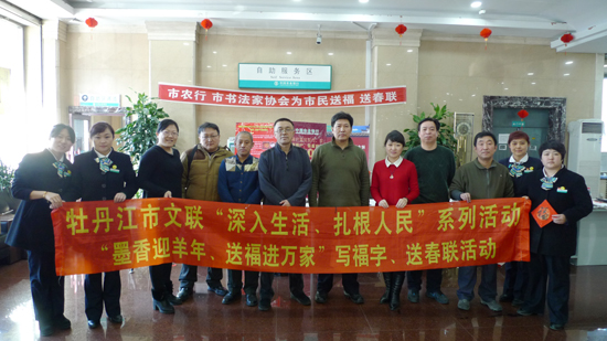 2月15日,由牡丹江市书协、市农行联合举办的“墨香迎羊年 送福到万家”为广大储户写福字、送春联活动在市农行营业厅举行。
