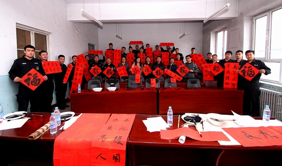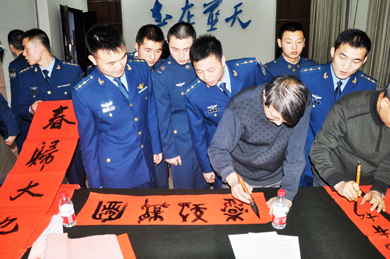 2月9日,“墨香迎羊年 送福到万家”暨情系北疆蓝天、共抒强军豪情写福字、送春联活动在驻牡93066部队隆重举行,在牡丹江市文联主席冯红、市书协主席韩润森的带队下,市文联副主席禇保军、书协顾问曹令臣、副主席周丹生、张东昌、张永昌、沈品岩、张殿林等一行16人来到驻牡某空军部队为广大官兵写福字,送春联,为他们送去新春祝福。