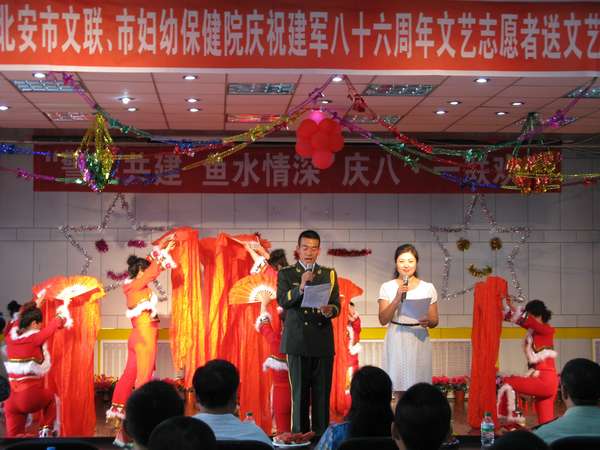 2013年7月30日,北安市文联、北安市妇幼保健院深入黑河武警支队二中队,与警营官兵联合举办了“庆祝建军八十六周年文艺志愿者送文艺进军营警民大联欢”活动。
