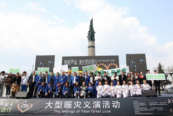 2013年4月26日,在象征着众志成城、万众一心、战胜灾难的哈尔滨防洪纪念塔旁,一台“情系芦山——龙江爱在行动”哈尔滨文艺志愿者赈灾募捐义演在这里举行。