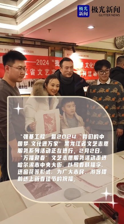 近日,“强基工程”暨2024“我们的中国梦 文化进万家”黑龙江省文艺志愿服务系列活动正在如火如荼地开展。2月2日,恰逢“小年”,“万福迎春”文艺志愿服务活动走进哈尔滨市中央大街,以写春联福字、送窗花等形式,为广大市民游客提前送上新春佳节的祝福。