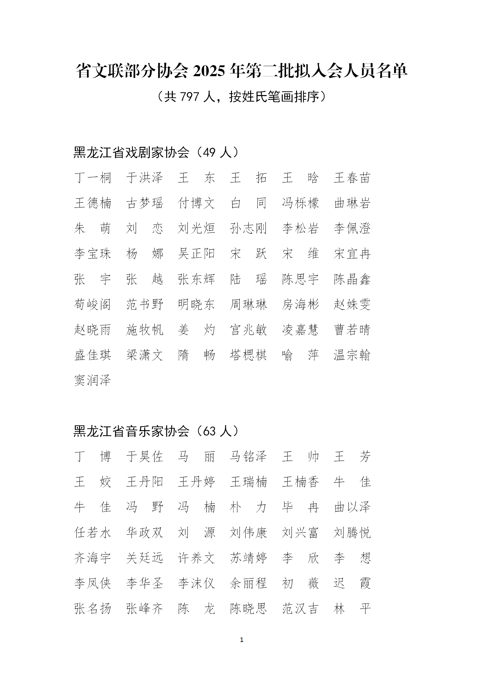 2025年下半年黑龙江省戏剧家协会、音乐家协会、舞蹈家协会、美术家协会、摄影家协会、书法家协会、曲艺家协会、民间文艺家协会、文艺评论家协会入会申报审批工作已经结束。根据相关协会章程及个人会员入会细则有关规定,经相关会议研究、按流程严格审核,共确定797名申报者为2025年第二批拟入会人员,现进行公示,名单如下。