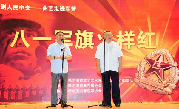 随后,一台“到人民中间——曲艺走进军营,八一军旗火样红”的文艺演出献给了广大官兵。演出在一首悠扬的《哈尔滨之夏》中拉开帷幕,歌曲《联勤官兵心向党》,唱出了官兵爱党信党跟党走的坚定信念和建设北疆的朴素情怀。传统快板的艺术表现形式,深情讲述了党和国家的发展历程,描绘了国家繁荣富强的伟大蓝图。歌曲《把一切献给党》,道出了部队官兵爱国奉献、听党指挥的信仰与坚守。市曲协的文艺志愿者表演了相声《学口技》、魔术、变脸表演等精彩节目,引起在场官兵阵阵掌声和欢呼声。特別是著名相声表演艺术家师胜杰与市曲协秘书长王刚合说的相声《笑口常开》,将演出推向了高潮。演出在《祝福祖国》的歌声中圆满结束。