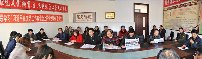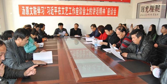2014年11月4日上午9时,汤原县文学艺术界联合会主席卢子槟主持召开了由文联所属八个协会领导和部分会员近40人参加的“学习习近平在文艺工作座谈会上的讲话”座谈会。中共汤原县委常委、宣传部长张兆峰、县人大副主任周昕参加会议并讲话。会议讨论热烈、涌跃,历时三小时,大家一致认为习总书记的讲话在新的时期具有重大意义,讲话中的“六个指出,六个强调”具有时代的针对性,对文化的发展具有指导性,是我们文学艺术工作者遵循的纲领,我们要用习总书记的讲话精神,深入群众,服务于人民,创造出更多更好的精品力作。