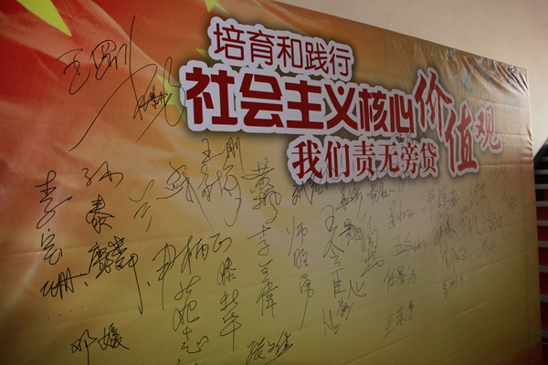 2014年10月14日,在哈尔滨市委宣传部副部长兰峰的带领下,哈尔滨曲艺界人士签署了“培育和践行社会主义核心价值观——---我们责无旁贷”的承诺墙。哈尔滨市文联党组成员、常务副主席高弟和哈尔滨市委宣传部文艺处、市文明办的有关领导及在哈的老曲艺家黄枫、尹柄正、李宝珊等及哈市曲协会员,老中青少四代曲艺工作者100多人参加了签名活动。