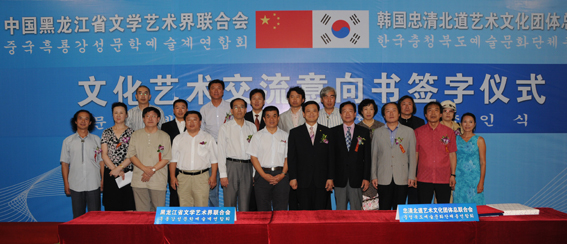 2009年8月17日,黑龙江省文学艺术界联合会与韩国忠清北道艺术文化团体总联合会文化艺术交流意向书签字仪式在省美术馆举行。省文联主席傅道彬与忠清北道艺术总会会长文常旭郑重签约。省文联副主席燕鹏、计世伟,省美协主席吴团良,省外办领导,韩国忠清北道艺术总会、美术家协会嘉宾出席签字仪式。