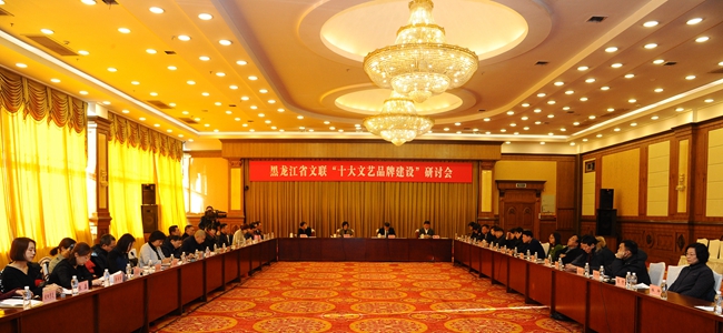 为深入学习宣传贯彻党的十九大精神,贯彻落实张庆伟书记到文联作协调研时的讲话精神,进一步推进省文联十大文艺品牌建设,制定发展规划和目标任务,提升文化内涵和品牌效应,2018年2月5日下午,黑龙江省文联“十大文艺品牌建设”研讨会在哈尔滨和平邨宾馆召开。省委宣传部副部长、省文联党组书记田文媛,省文联主席傅道彬,省文联党组成员、副主席计世伟、张戈等领导,以及各地市文联、行业产业文联负责人、十大文艺品牌相关单位负责人、十大文艺品牌艺术家代表和新闻媒体记者50余人参会。