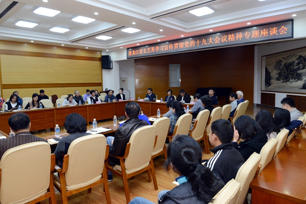 为了进一步学习宣传贯彻党的十九大会议精神,2017年11月1日下午,黑龙江省文艺界学习宣传贯彻党的十九大会议精神专题座谈会在省文联七楼会议室召开。省委宣传部副部长、省文联党组书记田文媛,省文联主席傅道彬,省文联党组成员、副主席计世伟、张戈,艺术家代表以及省文联干部职工、媒体记者50余人参会。会议由傅道彬主持。