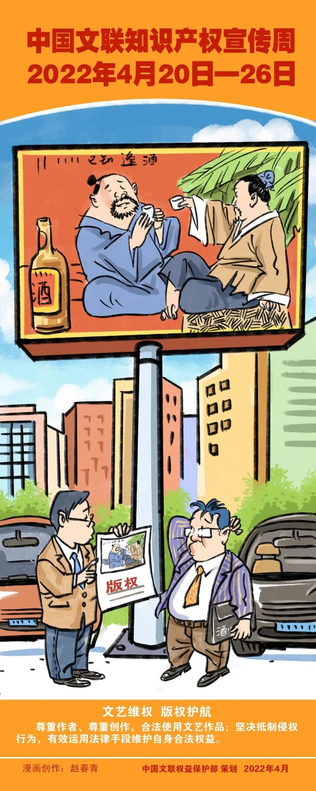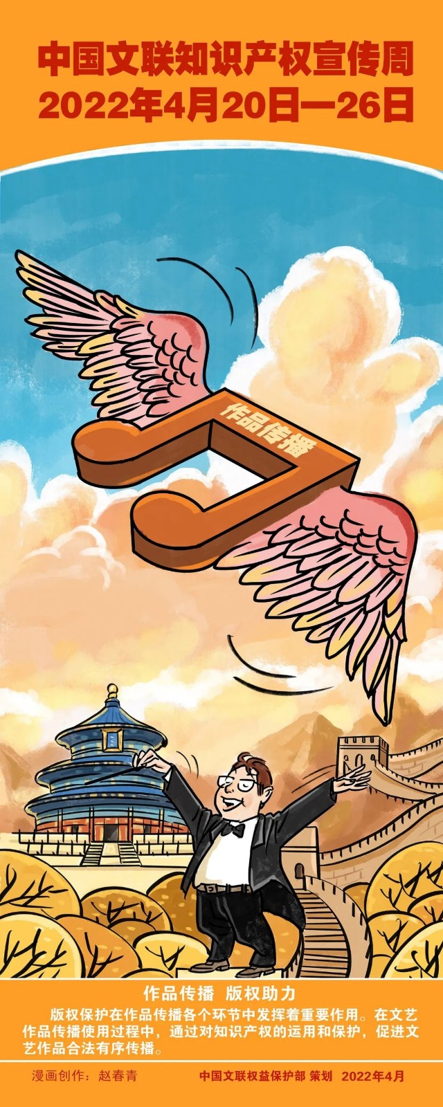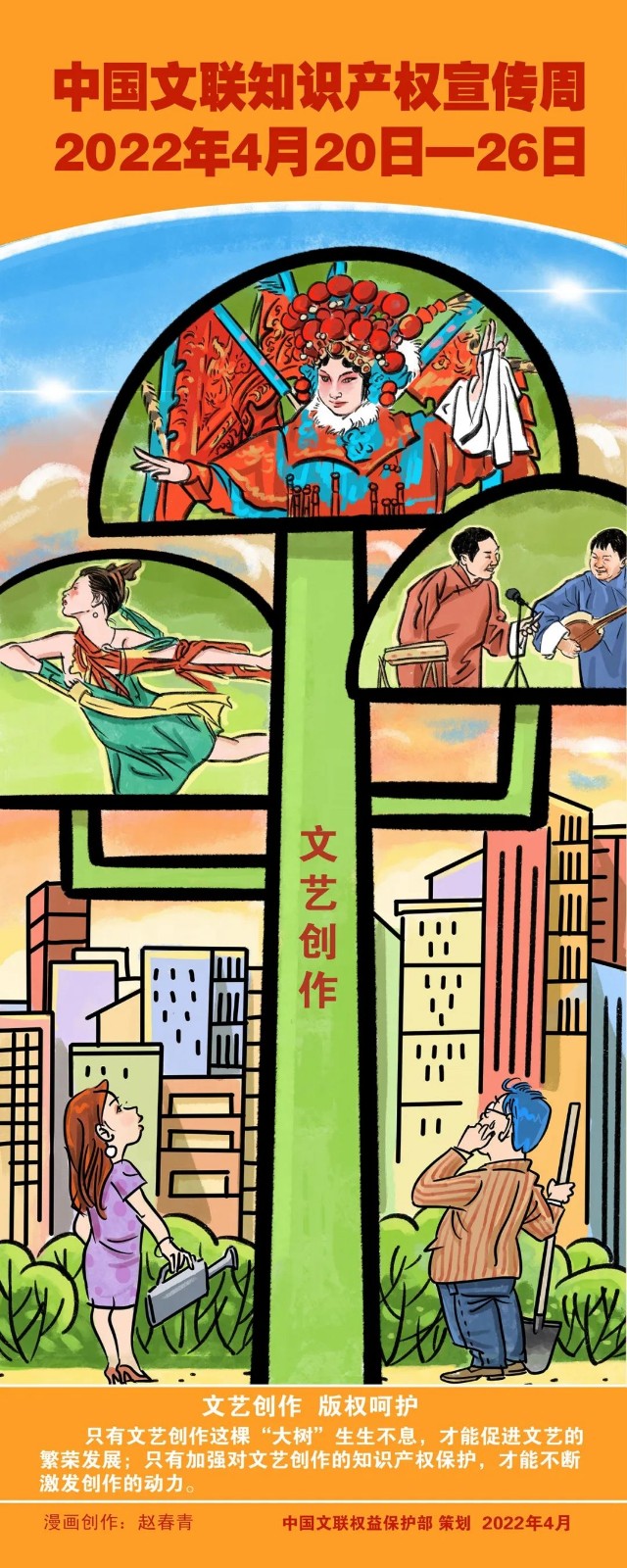在第22个世界知识产权日来临之际,“中国文联知识产权宣传周”活动于2022年4月20日正式启动。中国文联权益保护部围绕“强化知识产权保护  激发文艺创新活力”主题策划制作了宣传海报漫画,旨在学习贯彻党的十九大和十九届历次全会精神,坚持以习近平法治思想为指导,认真落实习近平总书记在中国文联十一大、中国作协十大开幕式上的重要讲话精神,切实履行文联组织自律维权职能,推进《中国文联关于进一步加强文艺维权工作的指导意见》和中国文联“八五”普法工作的实施。通过开展知识产权宣传周活动在文艺界倡导尊重创作、鼓励创新,不断提升文艺界知识产权保护的意识和能力。