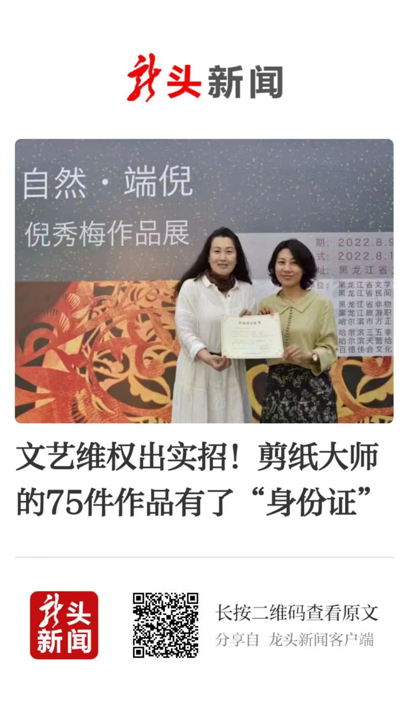 【媒体视野】龙头新闻8月22日刊发:文艺维权出实招!剪纸大师的75件作品有了“身份证”