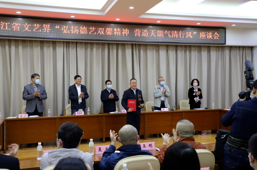 省文联为荣获第五届“全国中青年德艺双馨文艺工作者”称号的省文联副主席、省曲协主席刘彤代颁荣誉证书和奖杯