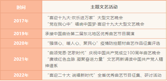 省曲协广泛引领曲艺工作者紧紧围绕迎庆党的十九大、新中国成立70周年、中国共产党成立100周年、党的二十大召开等重要时间节点,积极投身决战脱贫攻坚、乡村振兴、抗击疫情等党和国家工作大局,开展了形式多样、丰富多彩的主题文艺活动,担当了曲艺事业和曲协组织培根铸魂、凝心聚力的职责使命,在时代的洪流中做出了曲艺工作者应有的贡献。
