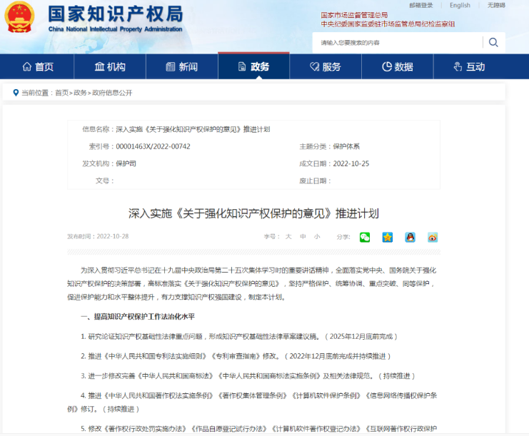 为贯彻落实党中央、国务院关于知识产权保护的决策部署,日前,国家知识产权局印发《深入实施〈关于强化知识产权保护的意见〉推进计划》(以下简称《推进计划》),明确了2022-2025年落实《关于强化知识产权保护的意见》重点任务和工作措施。