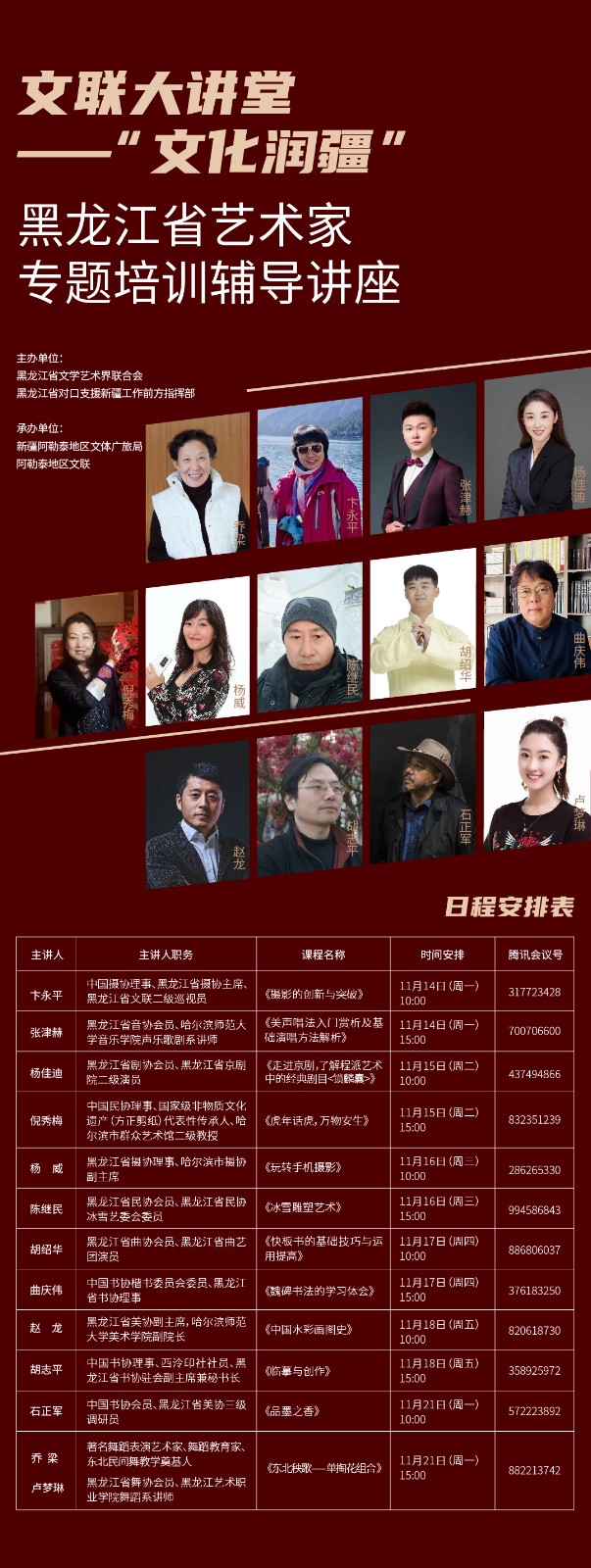 特别邀请著名舞蹈表演艺术家、舞蹈教育家、东北民间舞教学奠基人乔梁,中国摄协理事、黑龙江省摄协主席、黑龙江省文联二级巡视员卞永平,中国书协理事、西泠印社社员、黑龙江省书协驻会副主席兼秘书长胡志平,黑龙江省美协副主席、哈尔滨师范大学美术学院副院长赵龙,中国民协理事、国家级非物质文化遗产方正剪纸代表性传承人、哈尔滨市群众艺术馆二级教授倪秀梅,中国书协楷书委员会委员、黑龙江省书协理事曲庆伟,中国书协会员、黑龙江省美协三级调研员石正军,以及黑龙江省音协会员、哈尔滨师范大学音乐学院声乐歌剧系讲师张津赫,黑龙江省剧协会员、黑龙江省京剧院二级演员杨佳迪,黑龙江省摄协理事、哈尔滨市摄协副主席杨威,黑龙江省民协会员、黑龙江省民协冰雪艺委会委员陈继民,黑龙江省曲协会员、黑龙江省曲艺团演员胡绍华,黑龙江省舞协会员、黑龙江艺术职业学院舞蹈系讲师卢梦琳等老中青文艺家共计13人担任主讲,举办了《东北秧歌——单掏花组合》《摄影的创新与突破》《临摹与创作》《中国水彩画图史》《虎年话虎,万物安生》《魏碑书法的学习体会》《品墨之香》《美声唱法入门赏析及基础演唱方法解析》《走进京剧,了解程派艺术中的经典剧目<锁麟囊>》《玩转手机摄影》《冰雪雕塑艺术》《快板书的基础技巧与运用提高》等涵盖美术、书法、摄影、民间文艺、戏剧、音乐、舞蹈、曲艺的“文化润疆”黑龙江省艺术家专题培训辅导讲座12期,线上培训阿勒泰地区文艺工作者和文艺爱好者近4000余人次,丰富的培训内容和多样的培训形式受到了学员们的热烈欢迎和一致好评。艺术家们坚持艺术质量,采取生动化、形象化、艺术化的讲授方式,润物无声地展现了中华优秀传统文化的艺术魅力,传播了中华民族共同体声音,充分发挥了文艺的示范引领作用,也为今后开展省区间网络培训和交流辅导活动做出了有益尝试。