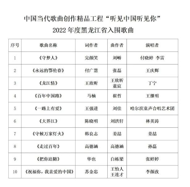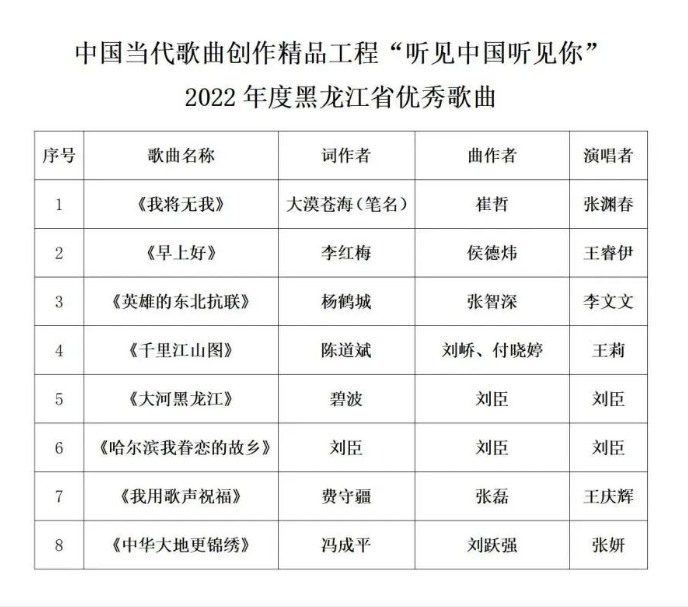 中国当代歌曲创作精品工程“听见中国听见你” 2022年度黑龙江省优秀歌曲评审结果公示