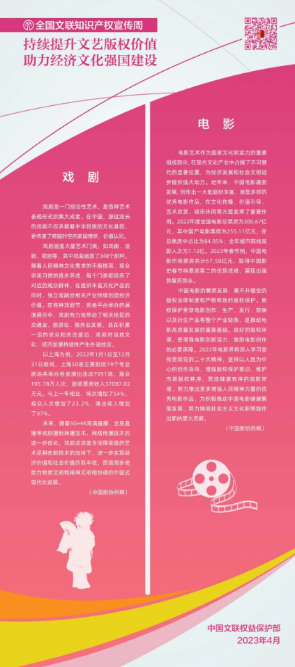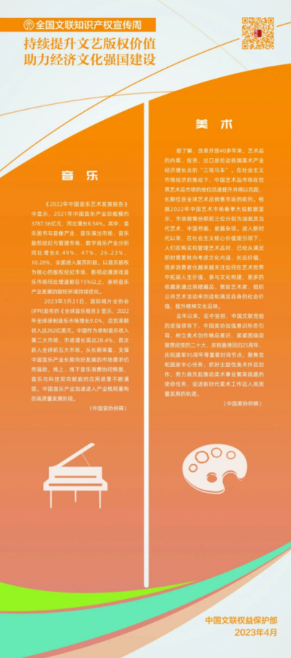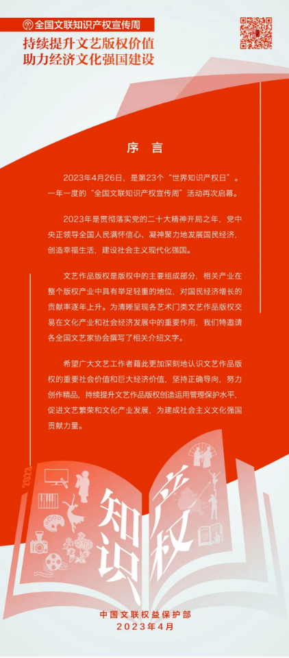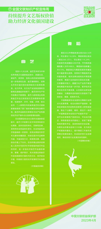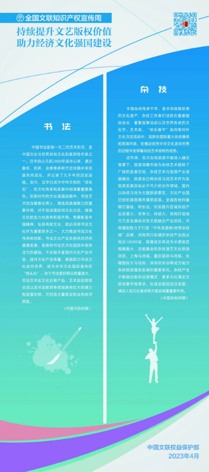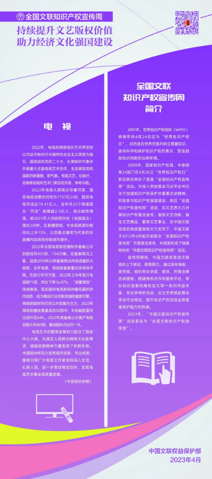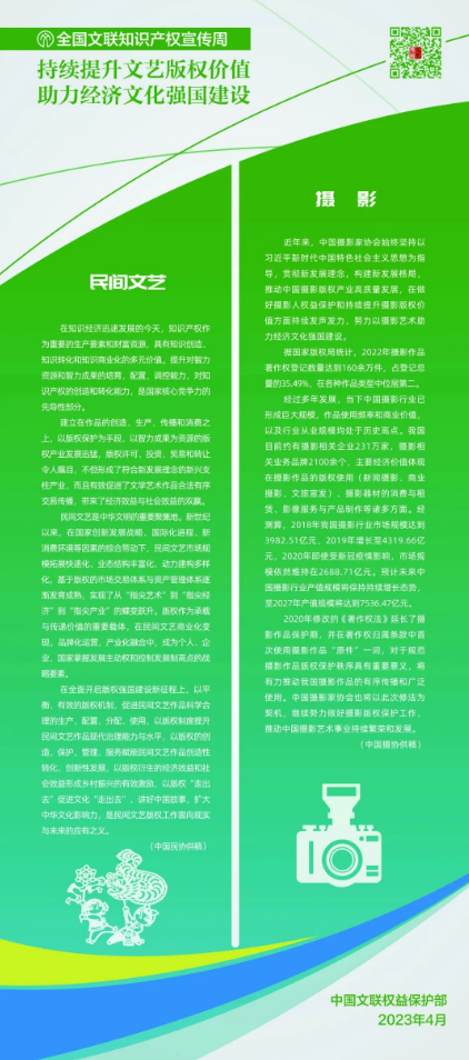 在第23个世界知识产权日来临之际,一年一度的“全国文联知识产权宣传周”活动将于4月24日正式启动。为激励广大文艺工作者多出精品力作,深入发掘文艺作品版权的经济社会价值,助力经济、文化强国建设,本年度“全国文联知识产权宣传周”活动的主题定为“持续提升文艺版权价值 助力经济文化强国建设”。中国文联及其团体会员,包括11家全国文艺家协会和各省(区、市)文联组织将同期策划举办一系列知识产权普法宣传活动。