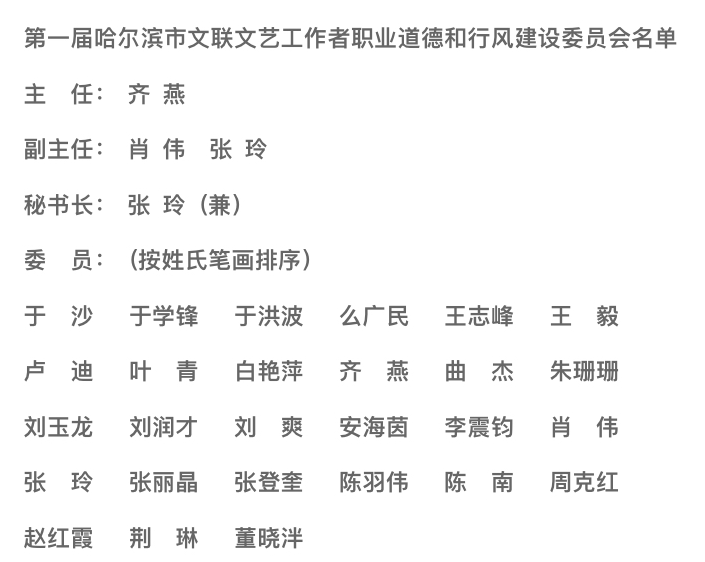 文艺工作者职业道德和行风建设委员会旨在积极引导督促全市文艺工作者,围绕举旗帜、聚民心、育新人、兴文化、展形象的使命任务,遵守法律法规、恪守职业道德、承担社会责任,树立良好社会形象,维护健康的行业发展生态,积极营造文艺界昂扬向上、风清气正的发展环境,对哈尔滨市文艺工作更好发展必将起到积极的推动作用。