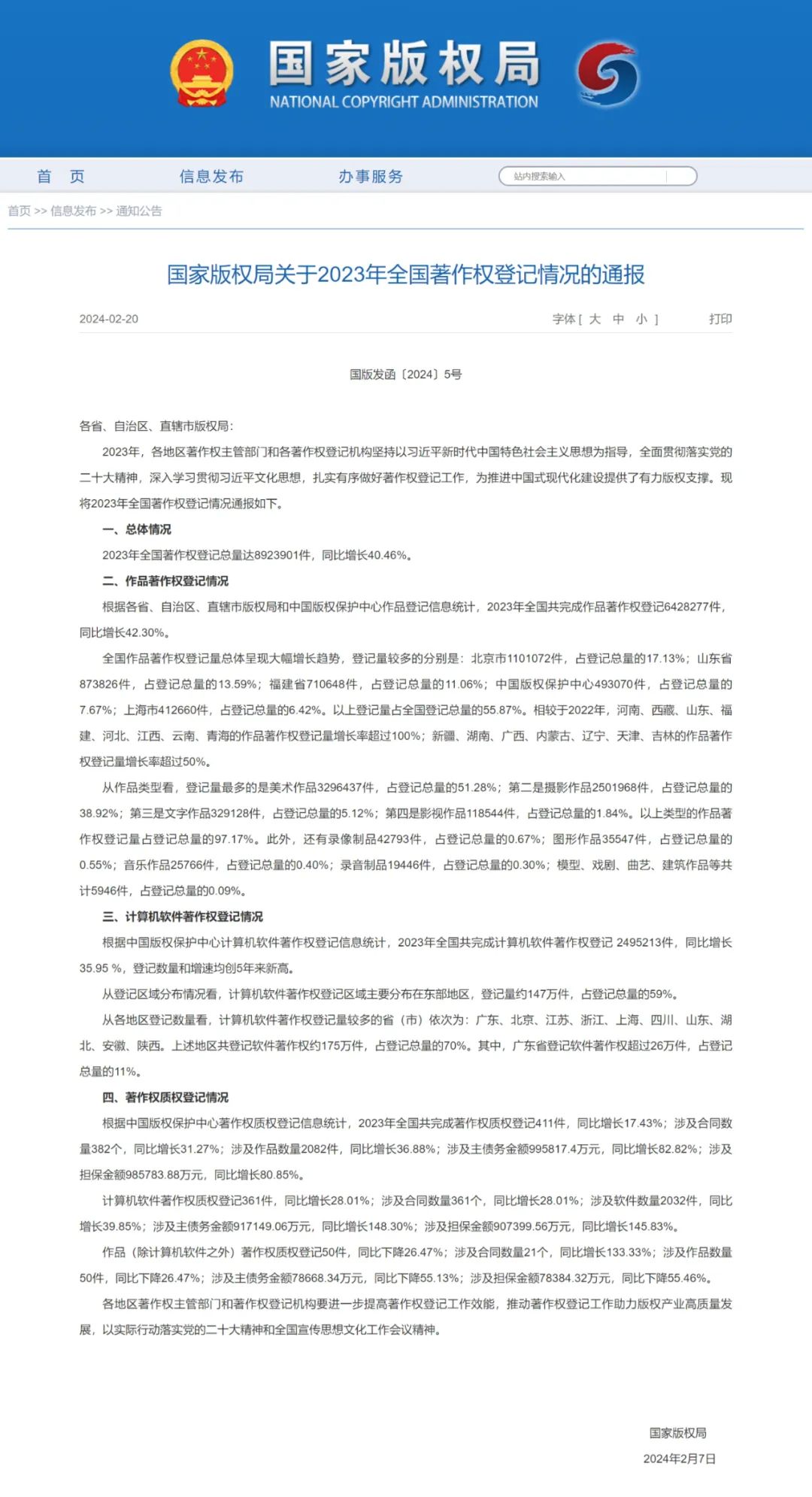 近日,国家版权局官网发布了《国家版权局关于2023年全国著作权登记情况的通报》(以下简称《通报》)。