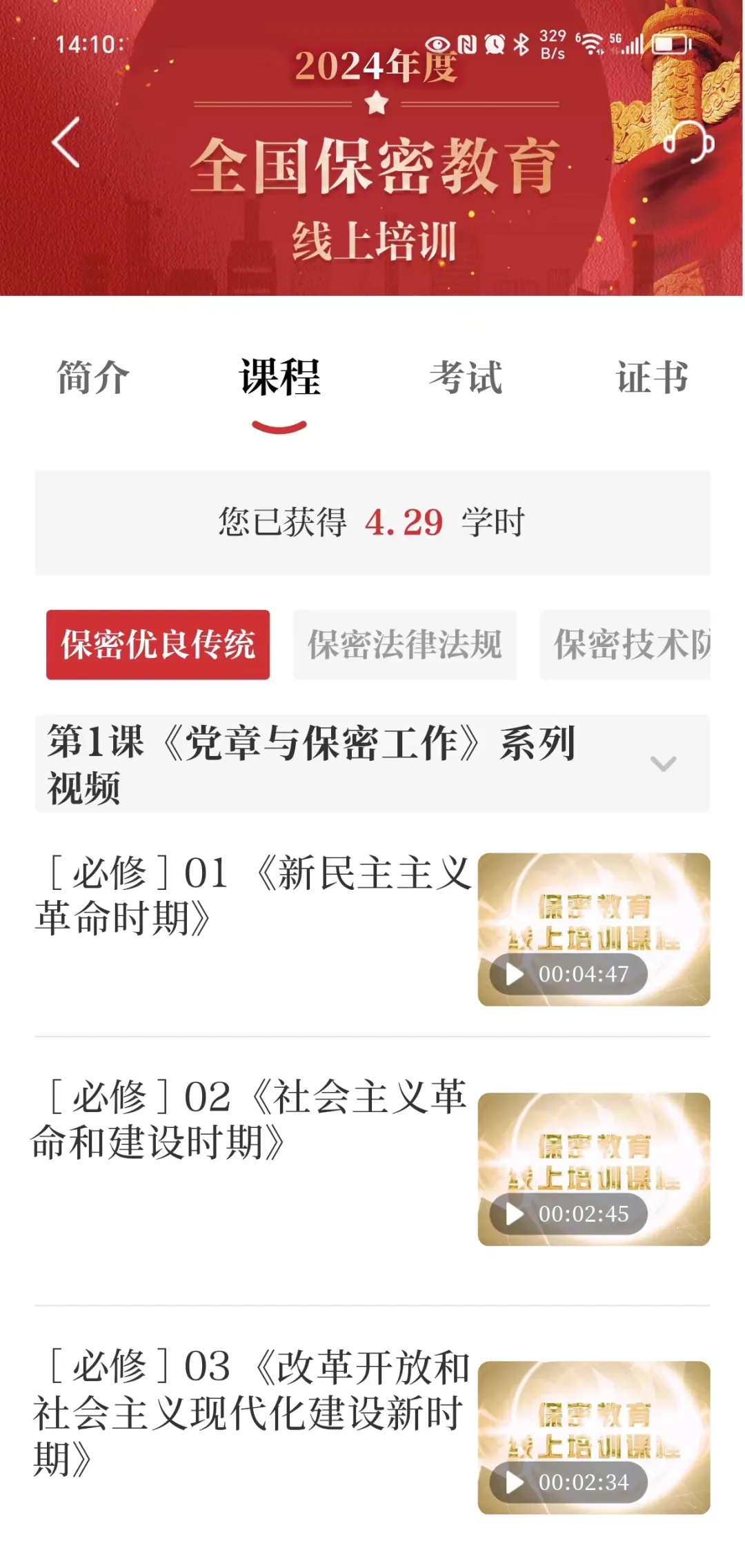 进入系统,点击“课程”开始学习。课程内容包含保密优良传统、保密法律法规、保密技术防范和保密警示案例4部分,以视频、音频为主。其中,标注“必修”字样的课程,是必须学习的内容。
