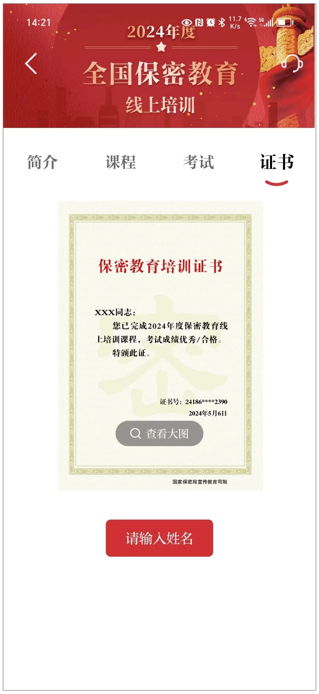 考试成绩合格,系统将自动生成证书,可填写姓名并将其下载保存至手机,自行打印。