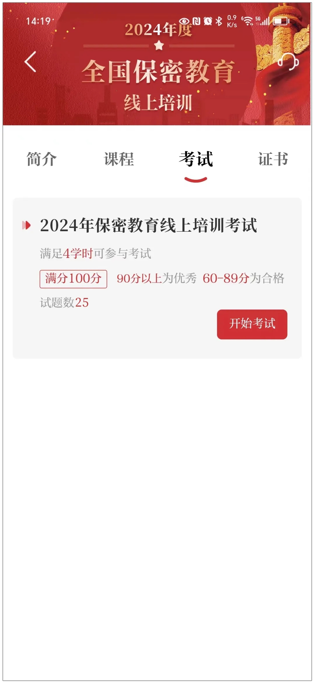 当学完4学时后,点击“考试”—“开始考试”。考试时间30分钟,共25道题,其中单选20道,判断5道。考试成绩满分100分,优秀90分,合格60分。