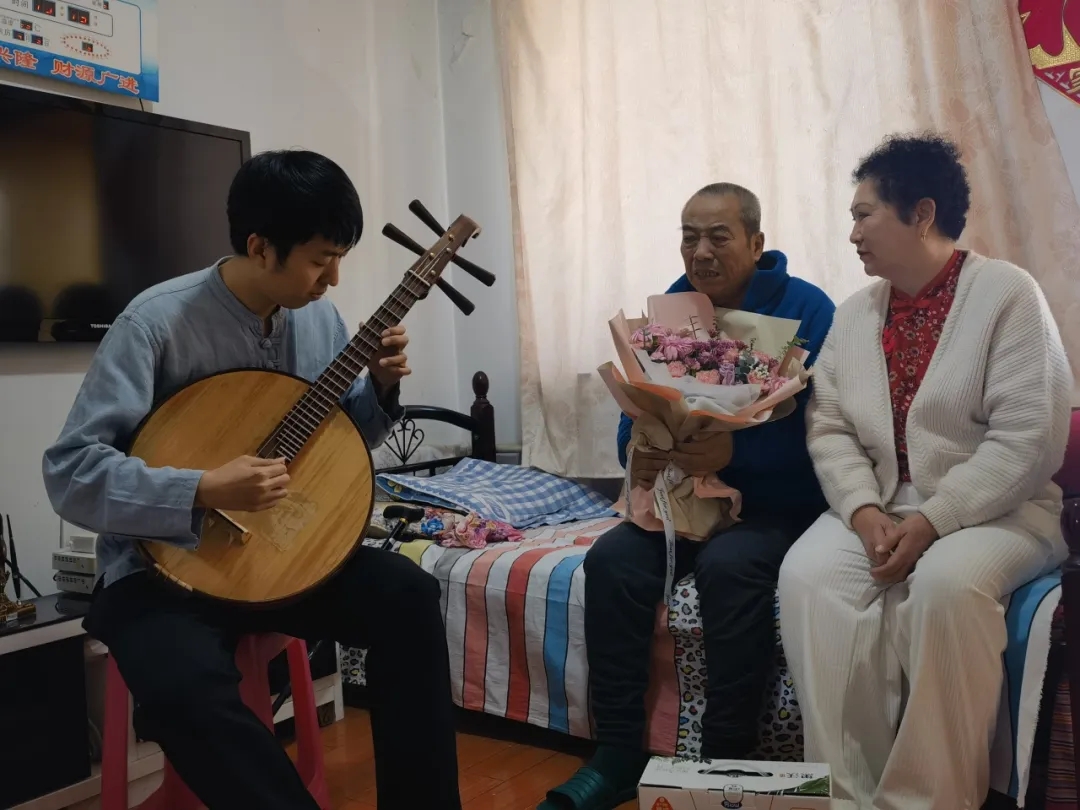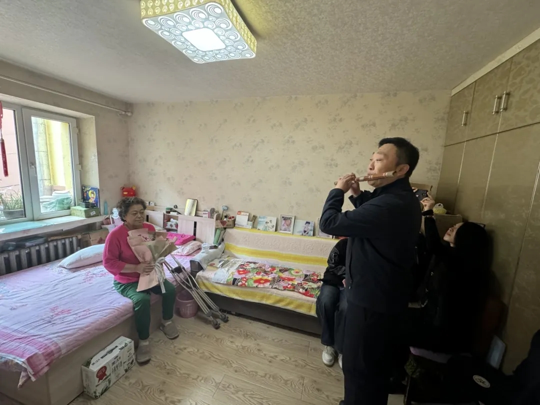 随后,志愿者们来到张女士家。志愿者们用竹笛吹奏了《姑苏行》,这首笛曲具有鲜明的江南风味,表现了古城苏州的秀丽风光和人们游览时的愉悦心情,同时也表达了大家对张女士身心安康的美好祝福。