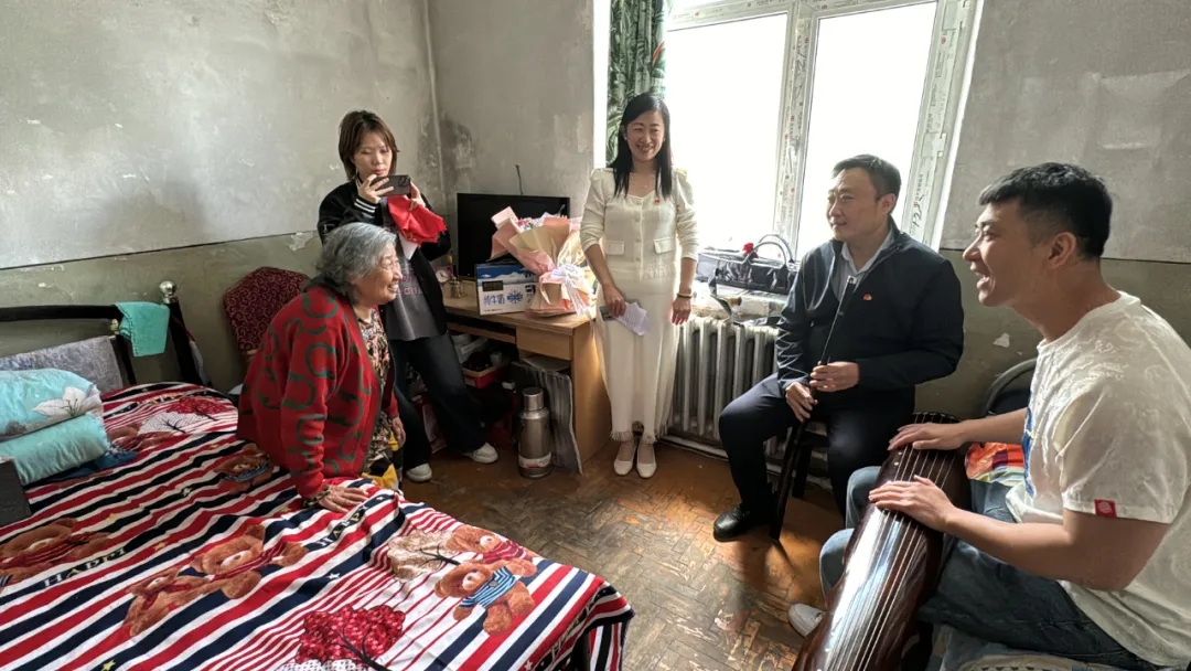 志愿者们首先来到张姓老人家。老人因为身体原因常年居家,不便外出。大家的到来让他感到格外高兴。“音乐两新”代表为他演奏了阮曲《茉莉花》和二胡曲《赛马》,悦耳的旋律送来了春的问候、草原的芬芳。