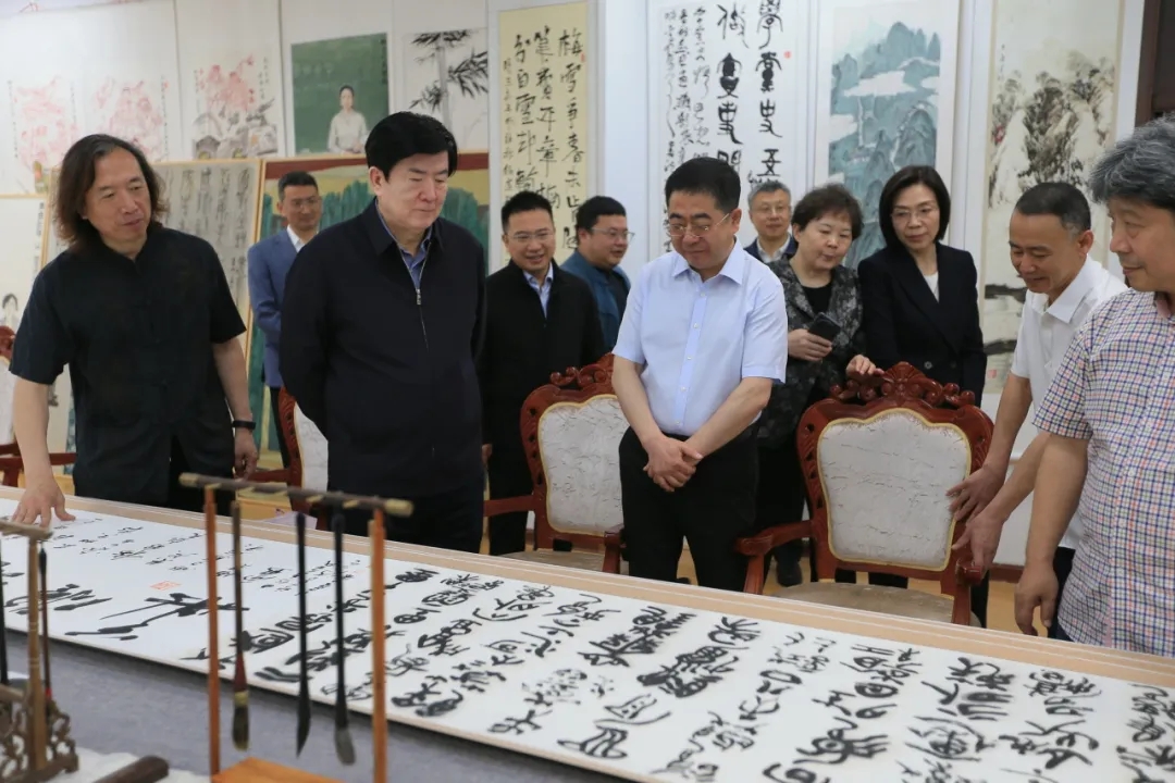 调研期间,恰逢省文联主办的第二届“文艺两新”艺术周系列活动有声有色进行中,调研组参观了艺心向党•“新新”向荣——黑龙江省“文艺两新”美术、书法、摄影、民间文艺创作成果展,到省文联机关考察了“艺术家之家”——省文联“臻艺”服务平台场馆,并与基层文联组织和艺术家代表围绕如何推进文艺文联工作高质量发展进行了座谈交流。李屹对文联干部饱满的工作热情、奋发的精神风貌给予了高度评价。他指出,新时代给文艺文联工作带来了新机遇新挑战,提出了新任务新要求。今年是新中国成立75周年,习近平总书记主持召开文艺工作座谈会发表重要讲话10周年,也是中国文联成立75周年,在这个重要时间节点,高质量发展是全国文联系统深化改革、优化职能的迫切需要,是首要任务、首要目标和工作主线。我们要积极探索,创新有为,把习近平总书记提出的“四个必须”明确要求贯彻落实到文联工作的各领域各环节各方面。在工作理念上牢固树立高质量发展的意识,在工作谋划上严格落实高质量发展的标准,在工作推进上充分体现高质量发展的要求,在队伍建设上生动展现高质量发展的精神状态,更加充分地发挥文联组织优势和专业优势,深度贯通“做人的工作”和推动文艺精品创作,切实推动资源优化整合,着力提升发展质效,凝心聚力担负新的文化使命,为建设社会主义现代化国家贡献文艺智慧和力量。