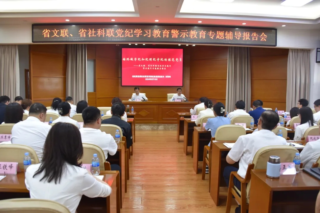 为进一步推动党纪学习教育走深走实,6月18日,省文联、省社科联联合开展党纪学习教育警示教育专题辅导报告会,邀请省纪委监委驻省委宣传部纪检监察组组长刘海峰作题为《始终做学纪知纪明纪守纪的模范党员》的党纪学习教育警示教育专题辅导报告。省文联、省社科联党员领导干部70余人聆听报告。