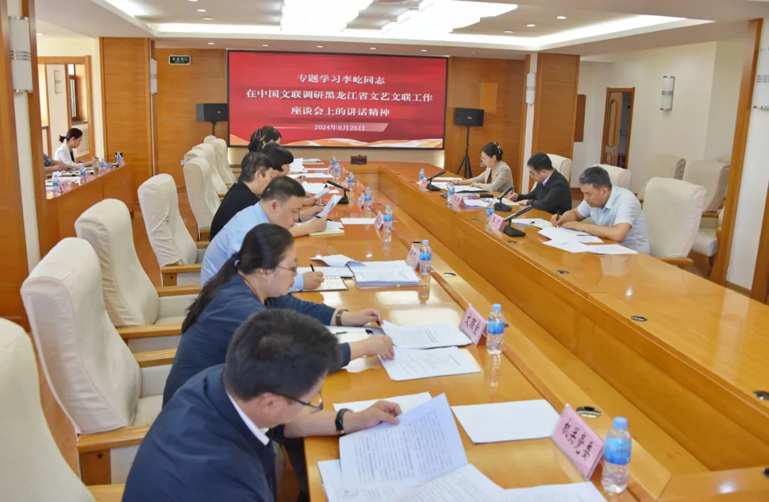 6月25日,黑龙江省文联召开党组(扩大)会议,学习传达中国文联党组书记李屹在中国文联调研黑龙江省文艺文联工作座谈会上的讲话精神,领导班子成员结合工作实际,交流学习心得体会,并围绕贯彻讲话精神研提落实举措。