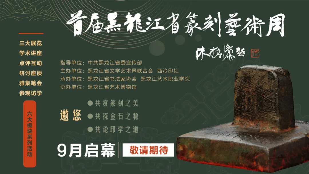 第一届当代中青年篆刻艺术双年展由黑龙江省文学艺术界联合会、西泠印社主办,是首届黑龙江省篆刻艺术周系列活动的重要组成部分。适逢举国迎庆中华人民共和国成立75周年,习近平主持召开文艺工作座谈会10周年,在学习贯彻党的二十届三中全会的热烈氛围里,黑龙江诚挚地邀请八方宾朋以印为媒,相聚在金风送爽的哈尔滨,共同领略中国篆刻艺术的独特魅力,见证并感受这项古老艺术在新时代的传承与创新中焕发出的勃勃生机。