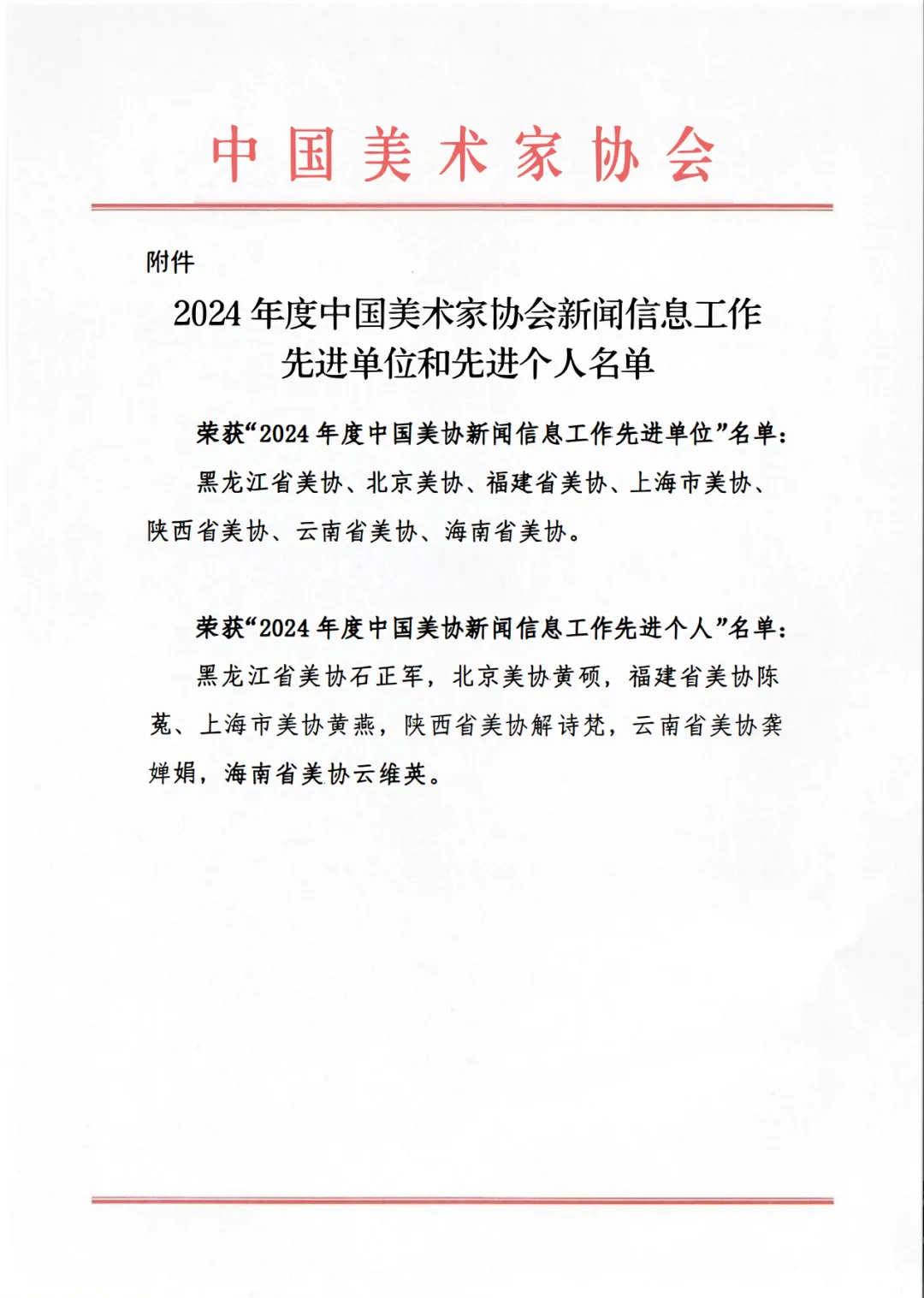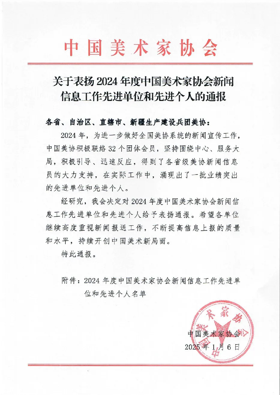 近日,中国美协第十届理事会第二次会议暨2025年中国美协工作会议在京召开,中国美协对在2024年度中国美术家协会新闻信息工作中成绩表现突出的先进单位和先进个人进行了表彰。
