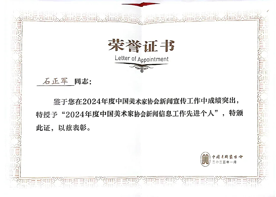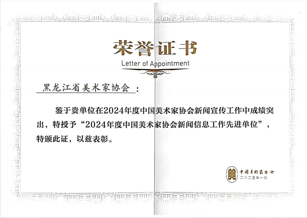 据悉,全国32个省、自治区、直辖市、新疆生产建设兵团团体会员中共有7家先进单位和7位先进个人受表彰。其中,黑龙江省美协荣获“2024年度中国美协新闻信息工作先进单位”,石正军荣获“2024年度中国美协新闻信息工作先进个人”。