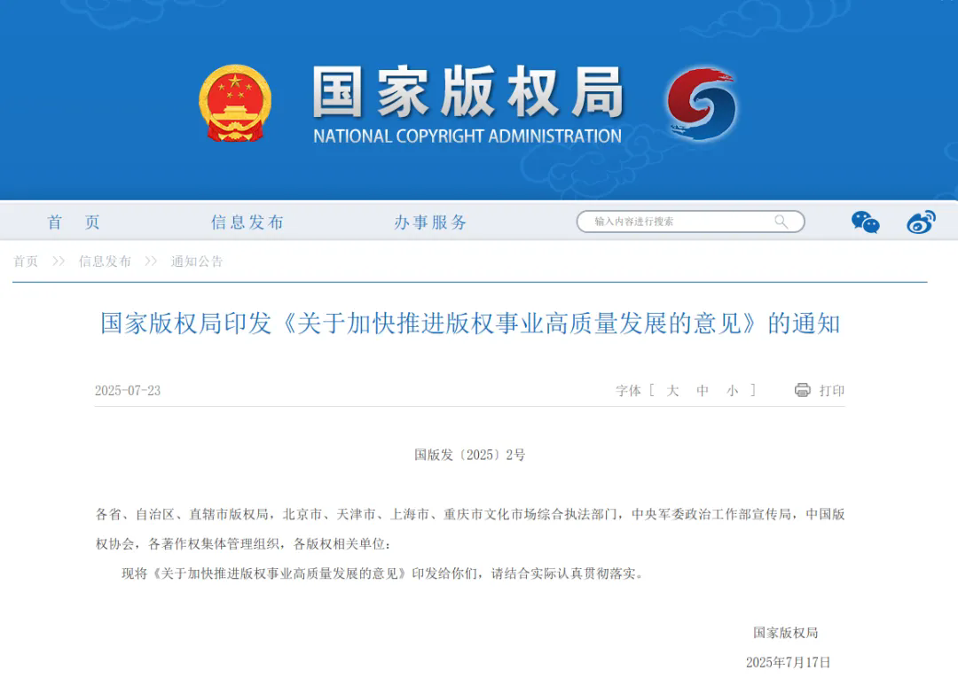 近日,国家版权局印发《关于加快推进版权事业高质量发展的意见》(以下简称《意见》),自2025年7月17日起施行。《意见》坚持以习近平新时代中国特色社会主义思想为指导,全面贯彻落实党的二十大和二十届二中、三中全会精神,深入学习贯彻习近平文化思想,牢牢把握高质量发展这个首要任务,坚持问题导向,紧扣版权实践,构建适应新技术发展的版权规则体系,推动版权工作规范化、数字化、智能化,推动版权要素与人工智能、大数据等领域新型文化业态、文化企业、文化消费模式深度融合发展。《意见》的发布实施对于全面提升版权创造、运用、保护、管理、服务水平,推进版权事业高质量发展具有重要意义。