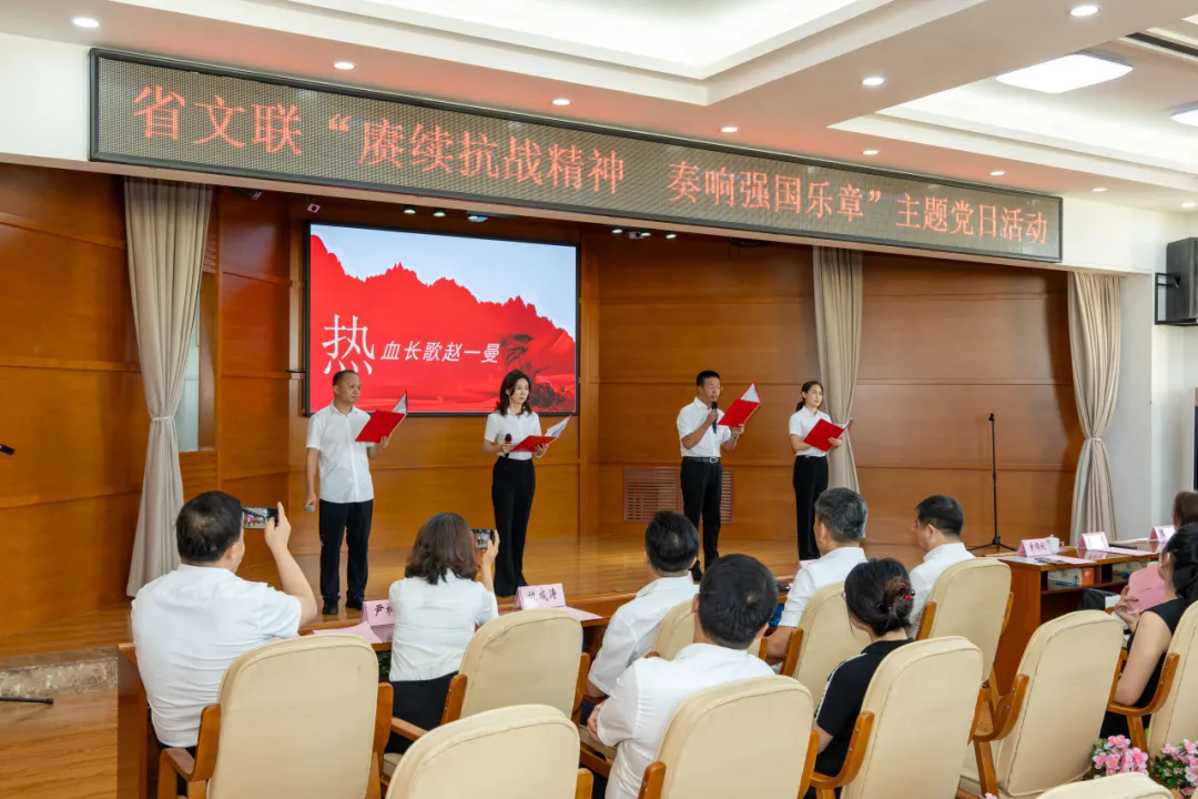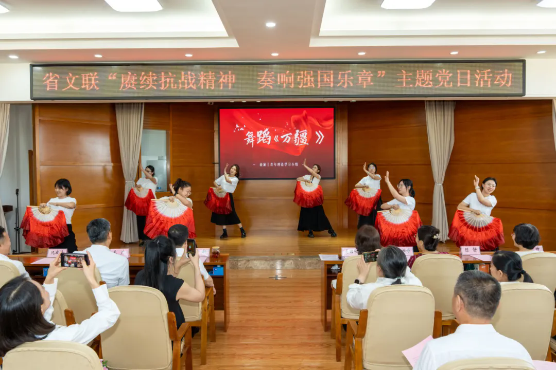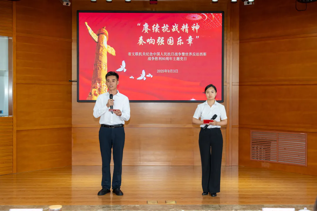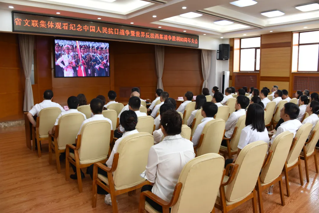 在纪念中国人民抗日战争暨世界反法西斯战争胜利80周年之际,9月3日,省文联组织开展了“赓续抗战精神 奏响强国乐章”主题党日活动。活动通过收看纪念大会直播、观看阅兵式、举行文艺展演等形式,回顾历史,缅怀先烈,凝聚力量。