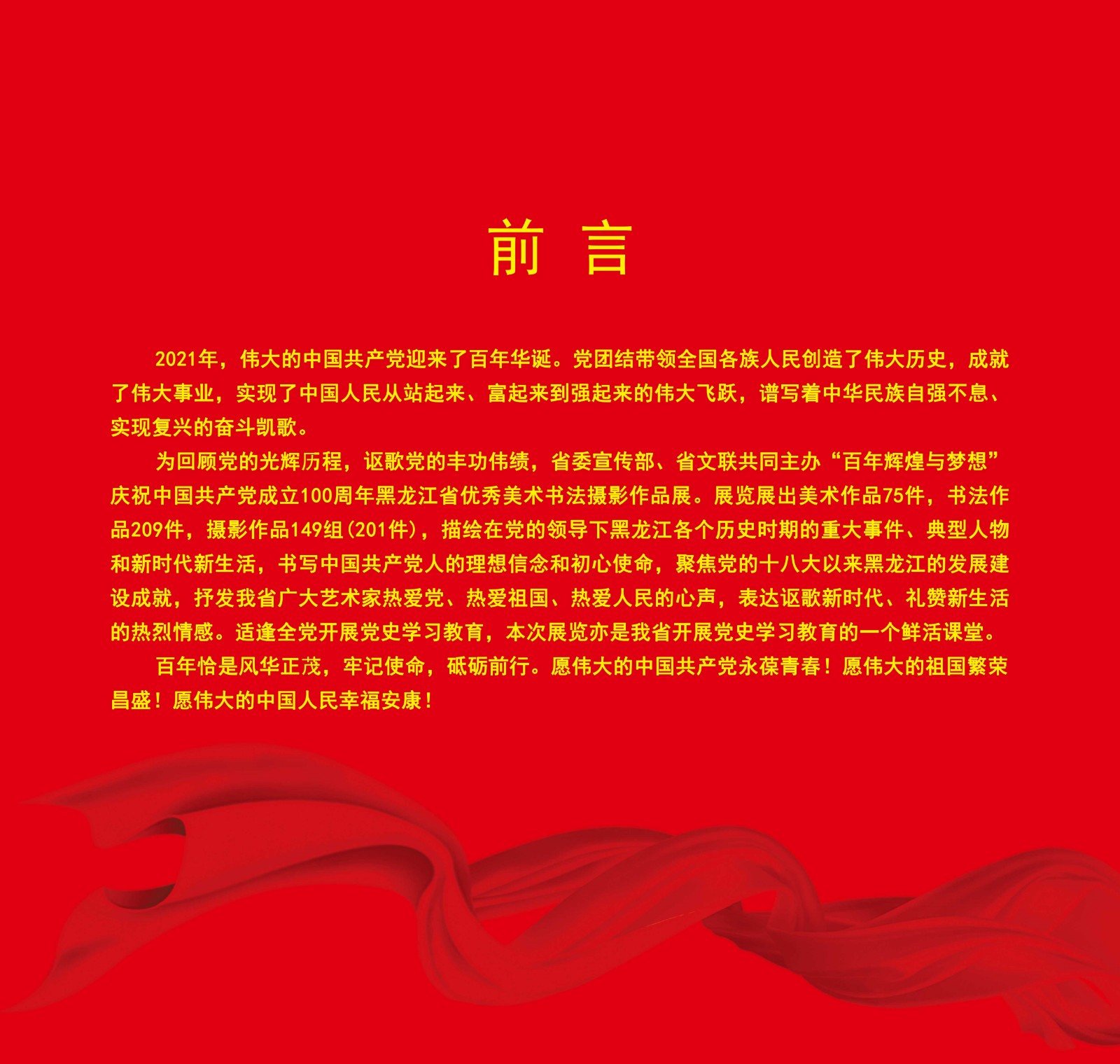 省委常委、省委宣传部部长贾玉梅在6月10日的展览开幕式讲话中说,黑龙江是革命的厚土、发展的热土,这片土地上铸就的浴血奋战史、艰苦创业史、改革创新史,形成的“东北抗联精神”“北大荒精神”“大庆精神”“铁人精神”等,是我们党百年党史中的重要组成部分,其中彰显的红色基因,赓续的精神血脉,昭示的奋斗意志,应该铭记,需要展现,必须永远弘扬。本次策展即以此为目标效果,以建党百年为时间脉络,以广袤的龙江大地为关照视域,精选400余件美术书法摄影优秀作品,全方位、多角度诠释黑龙江走过的光荣而艰辛的奋斗历程,艺术再现了黑龙江“百年辉煌与梦想”的恢弘图景。