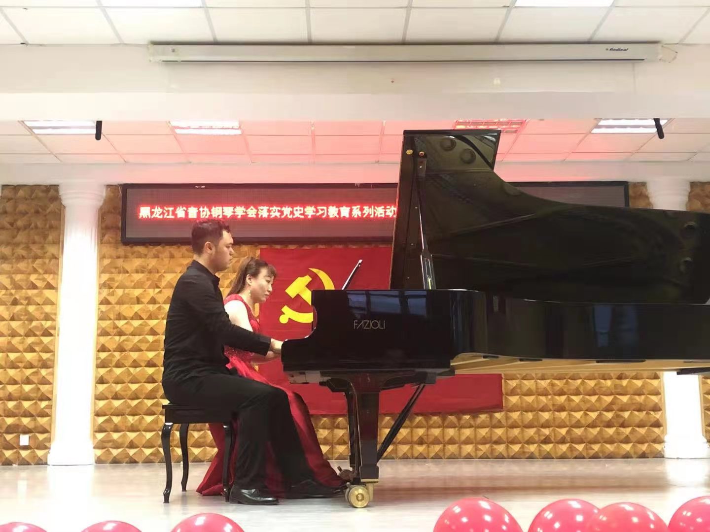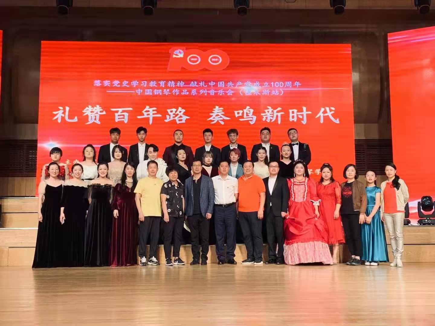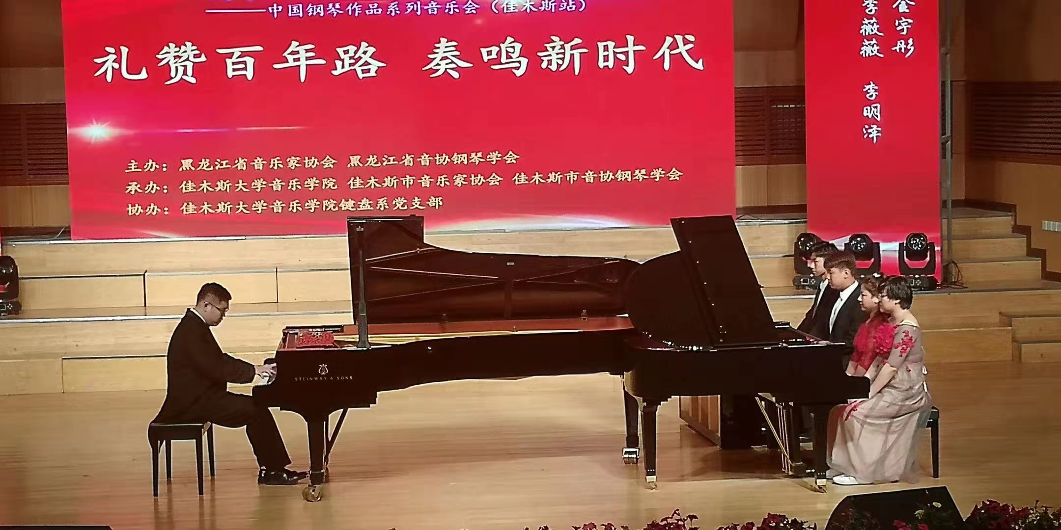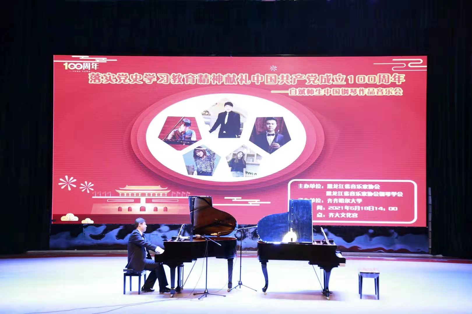 为庆祝中国共产党成立100周年,扎实开展党史学习教育,颂扬党的丰功伟业,唱响新时代主旋律,黑龙江省音乐家协会、黑龙江省音协钢琴专业委员会共同主办了“献礼中国共产党成立100周年”——中国钢琴作品系列音乐会。6月9日,系列音乐会在东北石油大学首演,之后在齐齐哈尔大学、哈尔滨师范大学、佳木斯大学相继举办,于7月8日在牡丹江师范学院音乐厅圆满落幕。
