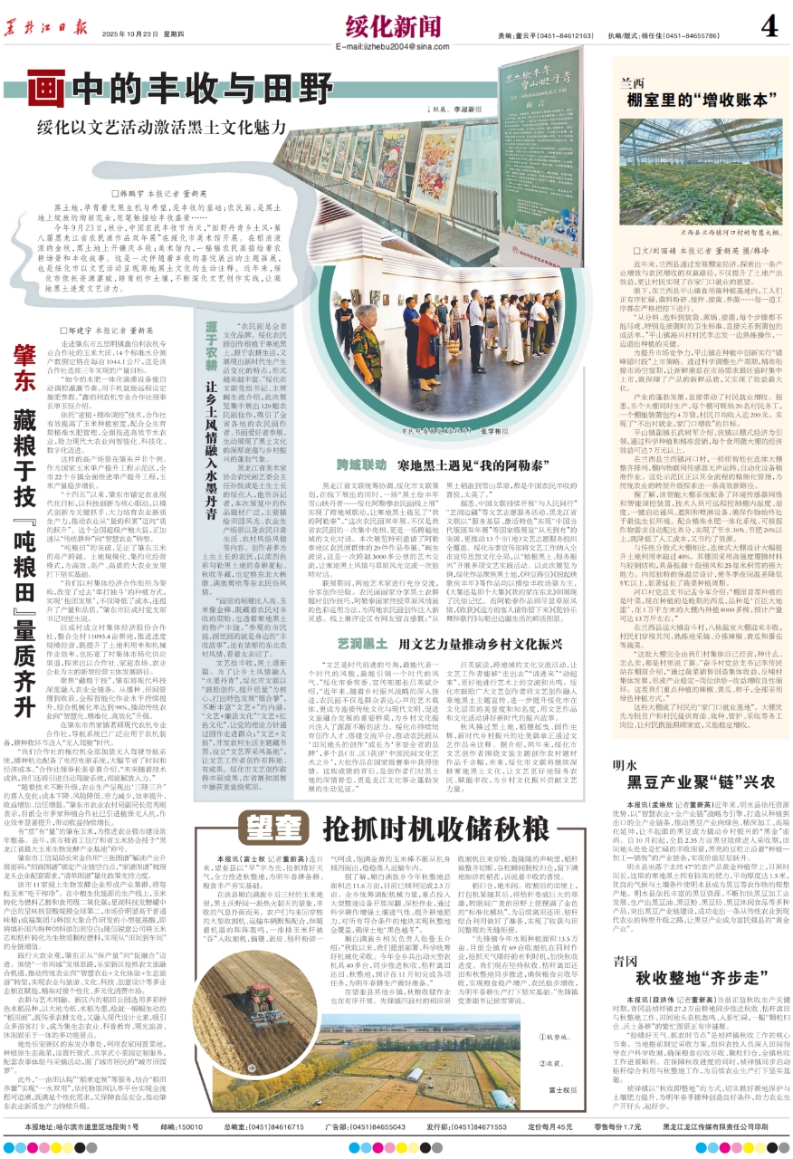 秋风拂过黑土地,稻穗摇曳、画作生辉,新时代乡村振兴的壮美篇章正通过文艺作品来诠释。据介绍,两年来,绥化市文艺创作者围绕文旅主题创作农村题材作品千余幅,未来,绥化市文联将继续深耕寒地黑土文化,让文艺更好地服务农民、赋能丰收,为乡村文化振兴贡献文艺力量。