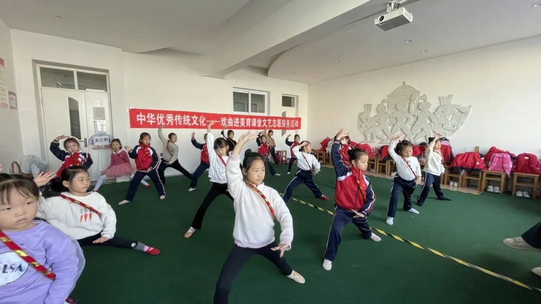 省剧协文艺志愿服务指导老师在继红小学美育课堂上指导孩子们龙江剧表演基础动作