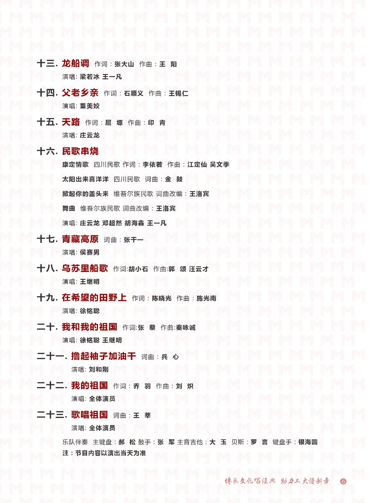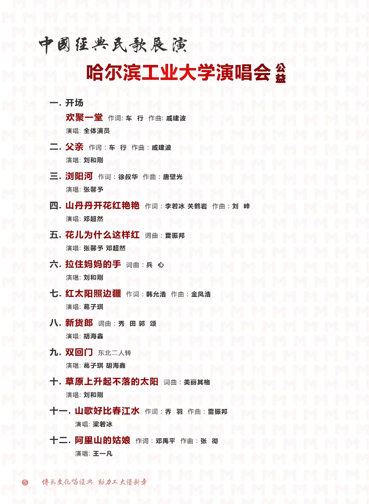 此次活动将用深受观众喜爱的电声乐队伴奏方式演绎经典,为哈工大师生呈现一场别开生面的民歌演唱会,让观众在熟悉的旋律中,领略民族文化的质朴厚重和传统民歌的时尚魅力。演唱会由哈尔滨电视台刘明慧担任嘉宾主持,汇集董美娇、侯赛男、王继明、庄云龙、邓超然、徐铭聪、胡海鑫、葛子琪、王一凡、梁若冰、张馨予等众多实力唱将和民歌新秀。这些优秀的青年歌者将演唱《乌苏里船歌》《草原上升起不落的太阳》《浏阳河》《山丹丹花开红艳艳》《花儿为什么这样红》等大江南北广为传唱的民歌经典。著名男高音歌唱家刘和刚带着他的代表作《父亲》在领衔此次公益演唱会的同时,还将担任本次活动的客串主持,为观众讲述经典民歌和《中国经典民歌展演》的更多故事。