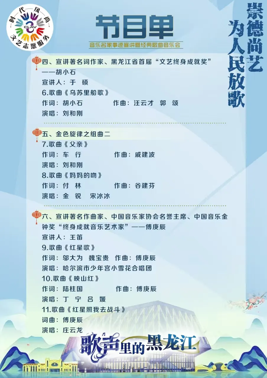 本场音乐会创意新颖、名家荟萃、经典云集。通过讲述傅庚辰、刘锡津、胡小石三位杰出艺术家艺术生涯中的精彩瞬间和感人故事,生动呈现艺术家们崇德尚艺、信仰坚定、勇于担当的精神风貌。音乐会还邀请到刘和刚、张英席、刘航、刘臣、庄云龙、党中华等艺术名家同台献艺,他们将以精湛的技艺和真挚的情感,演绎一首首经典歌曲,为观众带来一场精彩纷呈的艺术盛宴。