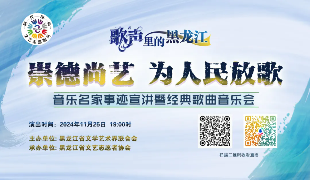 创新+名家+经典,生动感人的事迹宣讲,悠扬动听的经典旋律,一场别开生面的视听盛宴,歌声里的黑龙江——“崇德尚艺 为人民放歌”音乐名家事迹宣讲暨经典歌曲音乐会于11月25日19:00在哈尔滨音乐厅举行,黑龙江广播电视台文体频道官方视频号“一路向北fang”、腾讯政务黑龙江频道将同步直播,欢迎扫描下方二维码进入直播间收看。