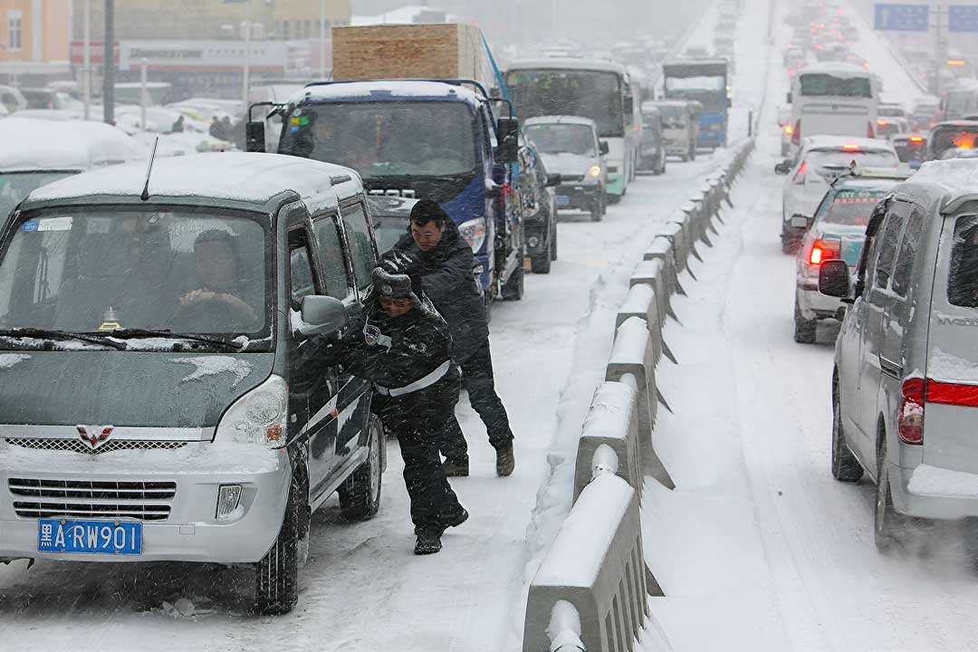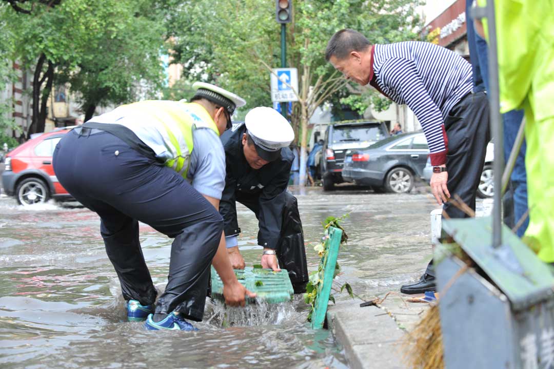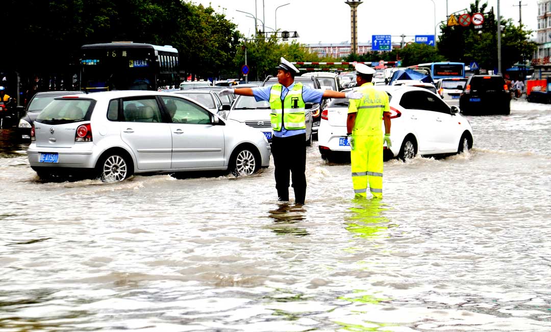《暴雨袭冰城交警在低洼路段排水保畅》摄影:杨志勇